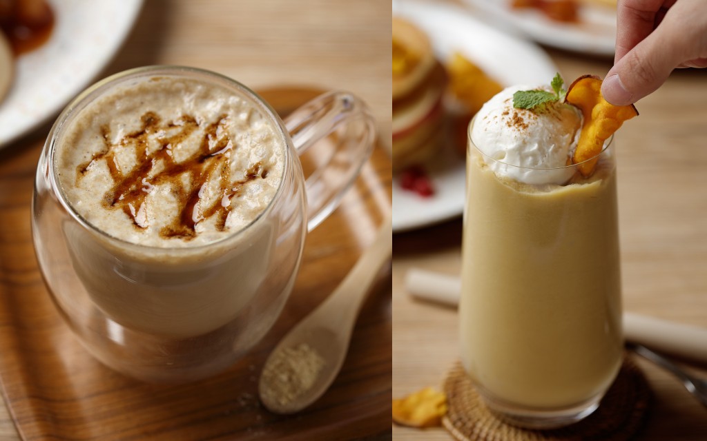 料理長將甘藷奶油、黑糖蜜、牛奶打製成奶昔般圓潤清爽風味,撒上些許肉桂粉、乾燥甘藷片點綴,地瓜思慕昔雖然是冷飲,喝起來仍具有甘藷的厚實香氣,不涼不躁,恰到好處。熱飲焙茶黑糖奶茶,則將焙茶熬煮為奶茶風格,焙茶特有深焙香氣,加上風味醇厚黑糖蜜,是杯入秋後帶來暖暖幸福感的美味飲品。