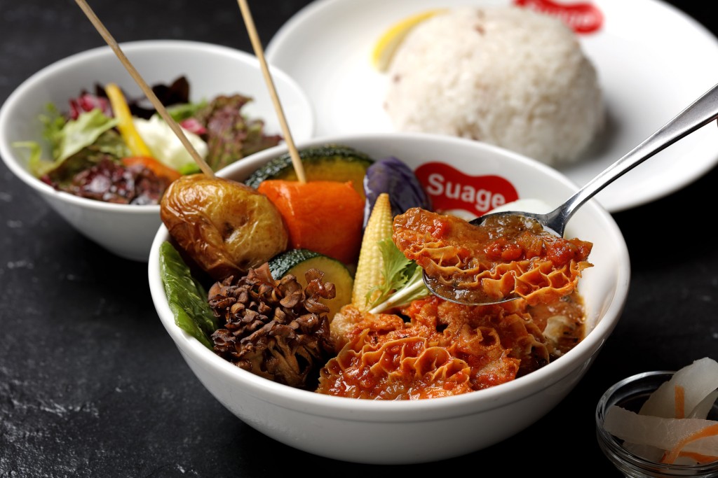 Suage湯咖哩專門店透過日本北海道直輸牛肚,以特製洋蔥泥、馬薩拉香料等多種香料熬製而成經典原味湯咖哩為基底,料理長費時費工清洗、以清酒、香料燉煮去腥處理,再放至番茄蔬菜湯頭裡燉煮1小時,加入帕馬森起司粉賦予香氣,並融合原味湯咖哩的辛香清爽。
