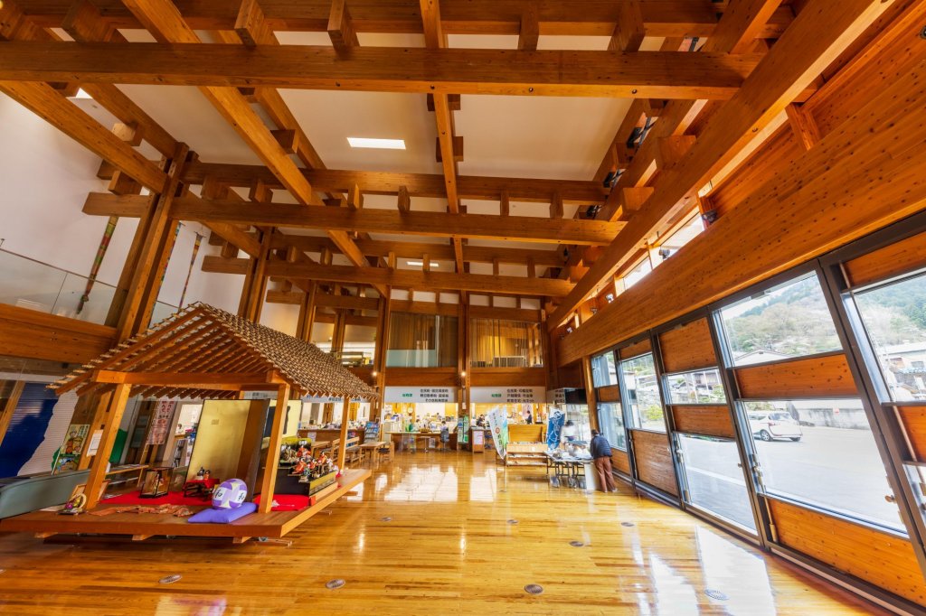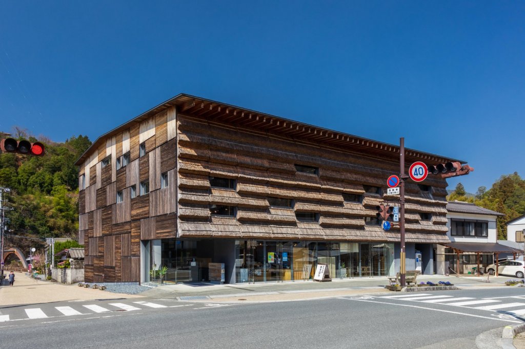 「小鎮驛站 檮原(Marche Yusuhara)」是隈研吾協同在地職人一同打造,一樓為物產館,二樓以上為雲之上飯店別館的複合型設施,最大特色是為外側的茅草建造,兼具散熱等功能。