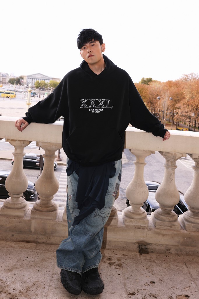 天王周杰倫出席巴黎時裝周欣賞Balenciaga(巴黎世家)2023春夏時裝秀,周杰倫穿著Balenciaga印有「XXXL」寬鬆連帽衫,一身個性勁裝展現天王氣場。