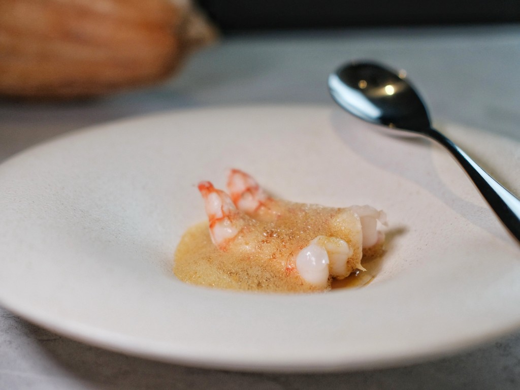 蝦這道菜的主角是海味鮮濃、口感滑脆的葡萄蝦,與盤底甜酒釀及文旦柚果肉一起入口,搭配南投木鱉果、陳皮、柳橙、昆布油做出的泡泡享用,整道菜鮮甜飽滿、風味豐富。