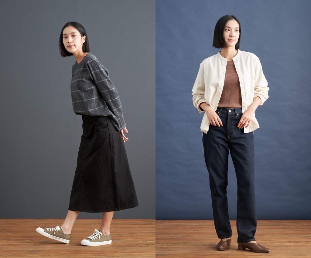 女裝有機棉法蘭絨套衫+有機棉綾織寬擺裙+撥水加工有機棉舒適休閒鞋,簡約的版型與灰黑配色展現沉穩優雅的氣質。
