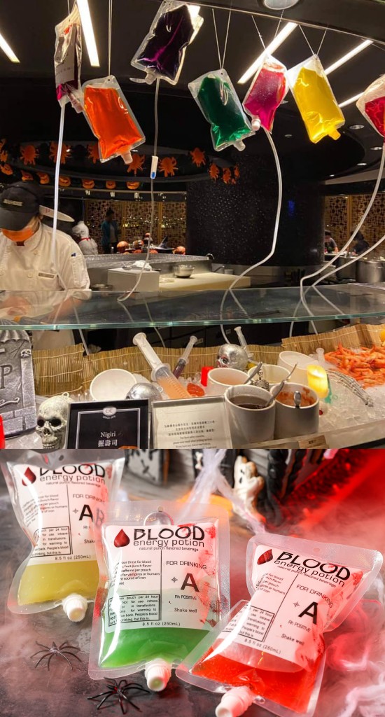 充滿惡作劇元素的「萬聖節血袋特調」,分別以紅石榴、柳橙及蜜瓜為基底調製3款繽紛無酒精飲品,盛裝飲品的容器特別選用時下超夯的血袋,創意又逼真的模樣,啜飲時宛如化身成吸血鬼般,營造萬聖節詭譎的氛圍。