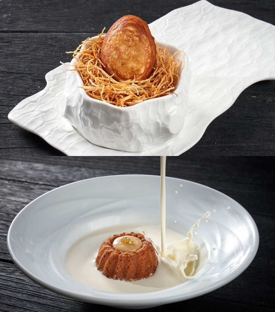 西點總主廚Hugo Ravier將古早味雞蛋糕加入香草及萊姆風味,盛盤搭配炸牛蒡絲製成鳥巢,推出精巧可愛的「香草雞蛋糕」,入口瀰漫香草與萊姆的清香,伴隨熟悉的香濃奶香。「花生磅蛋糕佐杏仁茶」發想自傳統杏仁茶油條,Hugo主廚選用香醇花生製成口感扎實的磅蛋糕,品嚐時淋上米香自製清香杏仁茶,展現柔和綿密口感。