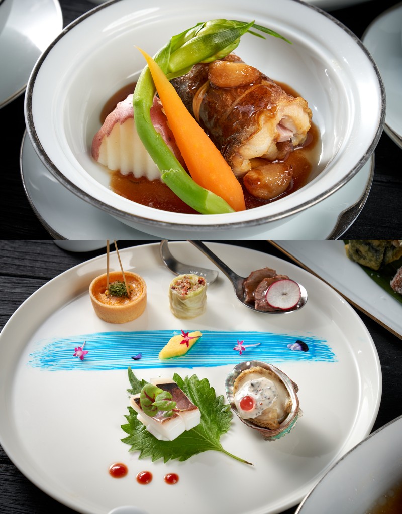 著重手工、外型可愛的「鯉魚大蝦」,新鮮明蝦經適當摔打後增加彈性,再以手工塑型於竹炭吐司,最後綴上一片片瓜子仁做魚鱗,油炸後帶著金黃色澤的鯉魚躍然於盤。主廚更將故鄉宜蘭美食「糕渣」與「糟餅」納入菜單。宴客佳餚少不了山珍海味,想要一嚐酸甜的糖醋滋味,「飄香五柳菊花魚」絕對是首要選擇。
