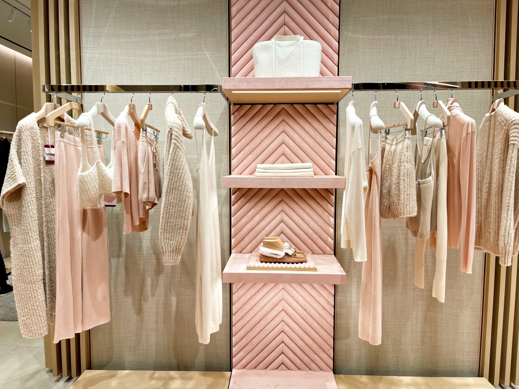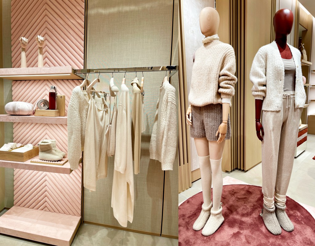 Loro Piana以頂級Cashmere材質著稱,全球期間限定店及店中店,每個項目均以柔和粉紅色為主調,帶出怡然自得、輕鬆和諧的格調,佈置陳設充滿質感及融合自然元素,突出Cocooning系列的輕柔色彩、上乘物料及表達的情感。
