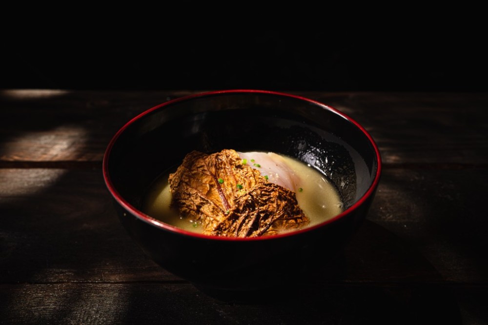 「甲魚茶碗蒸」選用每日新鮮處理的甲魚,與北海道昆布、清酒一起燉煮,,口感溫潤飽滿。「澄清雞湯」是雞生的最後巡禮,將金璟雞雞骨架、雞翅膠質一起熬煮、最後淬煉出金黃色的澄清雞湯,加入些許山椒粉、九鬼芝麻碎提香。