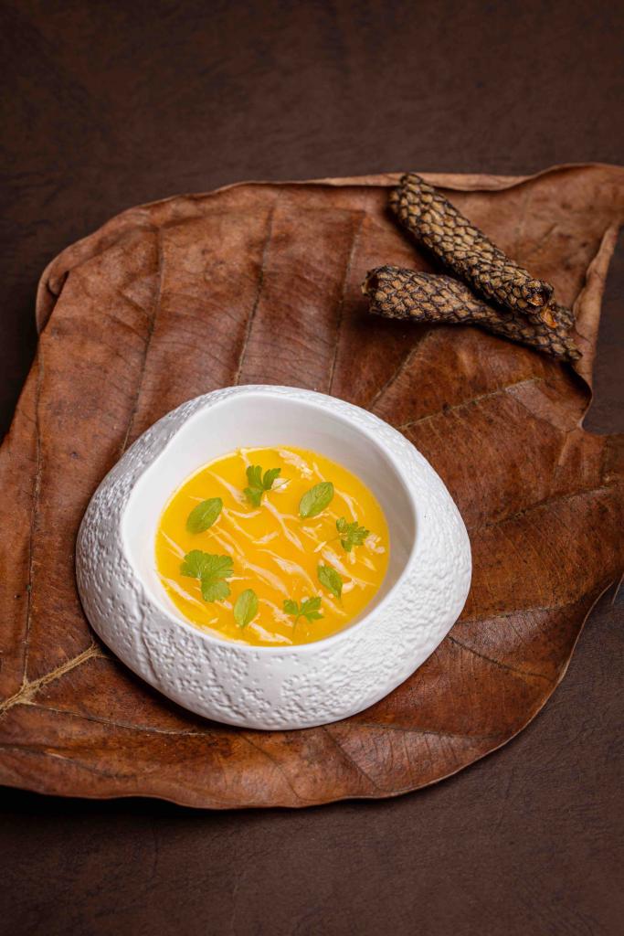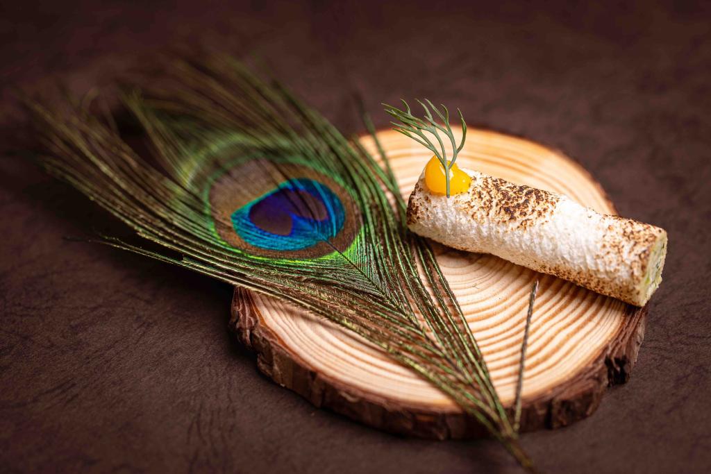 孔雀肉被主廚Nick戲謔形容擁有「最沒個性的肉味」,因為孔雀肉本身滋味相當輕柔,必須適當調味才能讓鮮美展現,《油封孔雀肉、打發奶油、蛋白酥餅》加入百里香與大蒜,每個部位進行不同溫度的舒肥,海鮮粥與蛇瓜的混合為內餡,帶有火烤的外皮香,咬起來酥化軟潤,孔雀肉化作清甜滋味,濃縮精華滋味,輕巧細緻,令人回味。