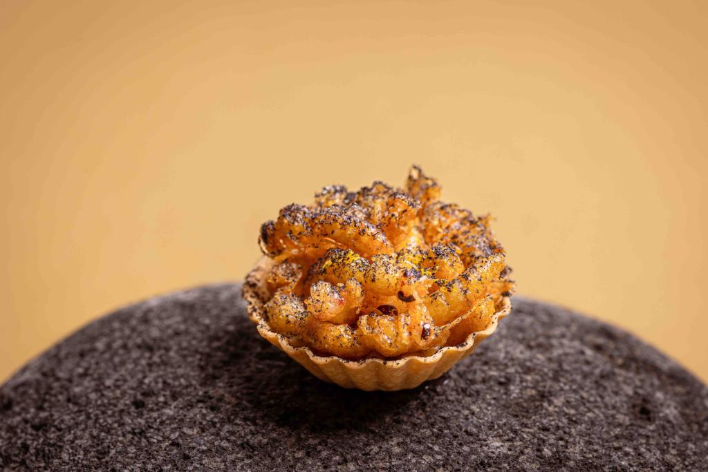 以《蜂蛹、炭烤洋蔥espuma、肚臍橙皮》揭開序幕,蜂蛹是主廚Nick充滿「家」的記憶的食材,「小時候我爸爸會去抓虎頭蜂,有時會將蜂蛹帶回家做料理,軟的就拿來炒蛋,開始冒角的就炸來吃。」蜂蛹富有滿滿蛋白質,酥炸後的蜂蛹吃起來有如炸馬鈴薯碎,微酸的口感,起司香氣濃郁,帶起開啟味蕾的任務。