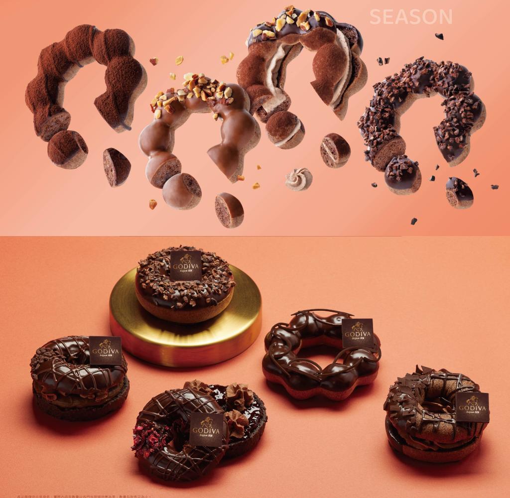 Mister Donut╳GODIVA共同推出「GODIVA莓果黑巧蛋糕圈」、「GODIVA伯爵黑巧蛋糕圈」、「GODIVA經典可可波堤圈」、「GODIVA榛果焦糖可可碎粒波堤圈」、「GODIVA經典可可波堤」5款低調奢華、簡約高雅聯名甜甜圈。