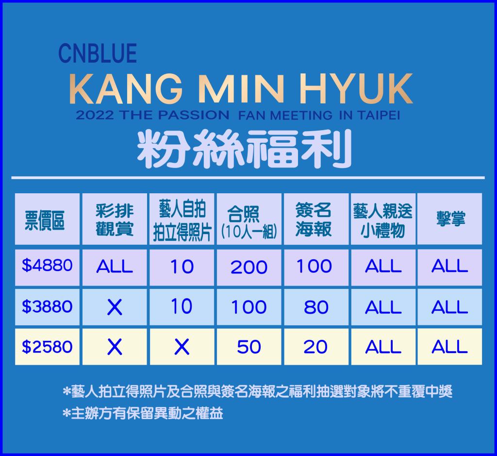 CNBLUE成員姜敏赫강민혁個人見面會,有超寵粉的粉絲福利,以台灣地區起點將在聖誕節前12月4日星期日舉行。姜敏赫將進行全場擊掌、面對面親送小禮物的寵粉福利,表達對台灣粉絲的感謝之意!