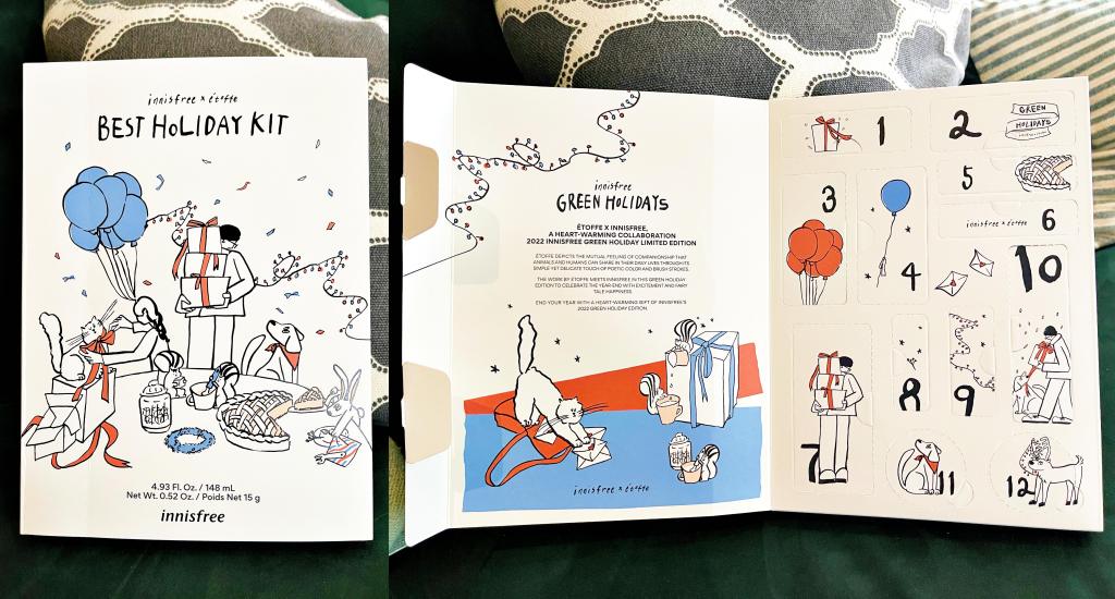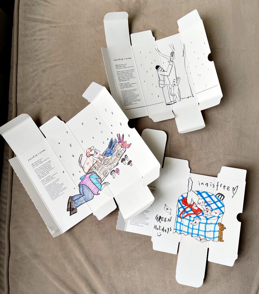 étoffe的作品與innisfree在綠色聖誕中相遇,以童話般的幸福感受歡慶年末,打造innisfree 2022綠色聖誕限定系列商品,溫暖你我的心。打開產品,盒內呈現出各種可愛的插畫細節,可以任意用彩色筆著色,別具創意巧思。