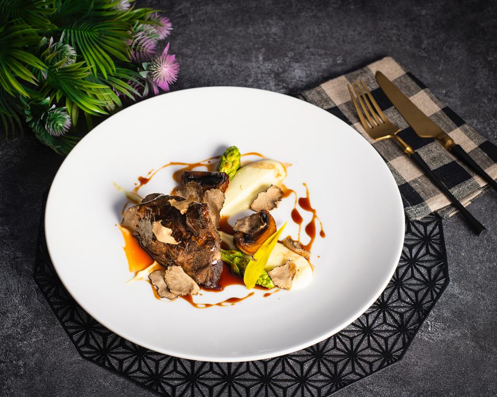 將澳洲頂級和牛頰肉以義大利知名紅酒品種Barolo巴羅洛紅酒悉心低溫燉煮24小時,呈現肉質極致柔嫩口感並富有彈性,因長時間燉煮過程,鮮嫩的晚香玉筍花香及巴羅洛紅酒中李子、黑櫻桃、紫羅蘭、八角等香氣與濃郁肉汁,完美融入細嫩的和牛頰肉中,搭配洋芋泥、晚香玉筍、蘑菇及上桌後,點綴現場鮮刨的秋季黑松露,迷人的黑松露麝香及榛果香氣融入後,美味至極,彼此襯托營造出豐富層次,把和牛頰的美味帶到另一新境界。