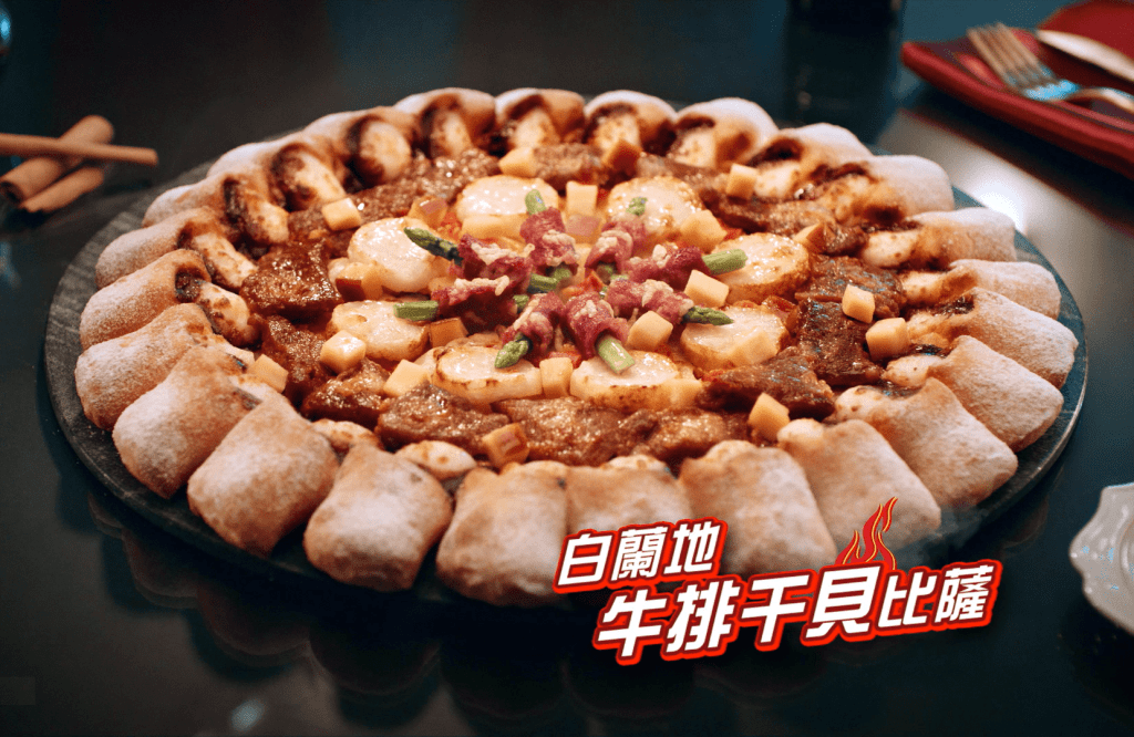 必勝客直接將比薩升等成頂級餐酒料理,推出豪華升級版頂級餐酒料理白蘭地牛排干貝比薩,將開胃菜培根蘆筍捲與鮮甜彈牙的炙燒干貝結合,加上5盎司厚切牛排,佐上法國干邑白蘭地熬煮而成醬汁,淡淡酒香與鮮嫩牛排完美搭配,再撒上必勝客精選荷蘭煙燻高達起司,採用櫸木天然煙燻熟成、帶有淡淡堅果香氣,迷人香氣讓牛排層次更豐富。