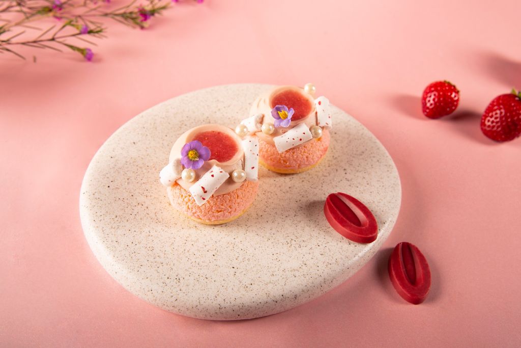 夢幻必嚐甜點包含「柚子草莓蛋糕」豔紅玫瑰造型,以草莓果泥及帶檸檬風味草莓凍為夾心,抹以日本柚子汁製成柚子奶油醬,層次感十足。