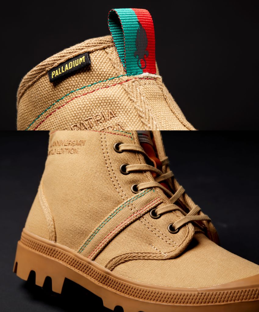 PALLADIUM創立滿75周年,特別以最初替法國外籍兵團製作的軍靴外型設計,打造全新代表性紀念靴款PALLABROUSSE LEGACY,靴身多處設計融入法國外籍兵團代表標誌及色系,以白色、綠色及紅色三個顏色組成,包含軍隊名稱Légion Étrangère、外籍兵團士兵配戴的白色軍帽,及象徵法國外籍兵團菁英部隊的火焰3個主要元素,鞋身處並以刺繡方式呈現軍團格言Legio Patria Nostra,展現聯名紀念細節與精湛製鞋工藝。