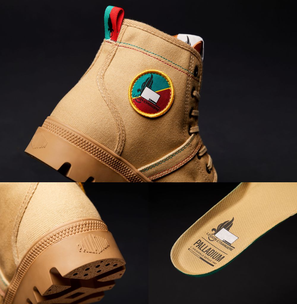 PALLABROUSSE LEGACY聯名軍靴以軍用帆布與真皮鞋舌異材質拼接展現細節,靴身及鞋跟織帶同樣繡有法國外籍兵團標誌,左右腳鞋舌分別縫上PALLADIUM品牌標誌及法國外籍兵團標誌,象徵一起邁向下個75年。