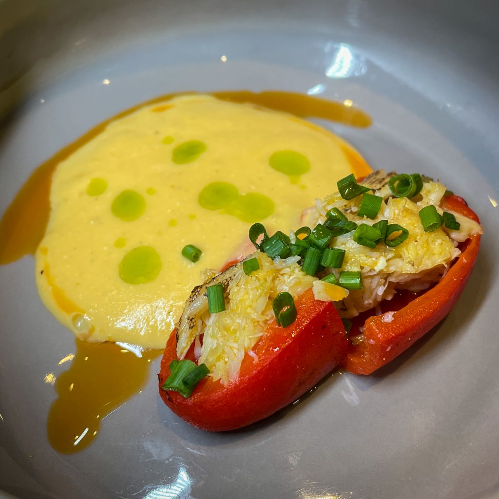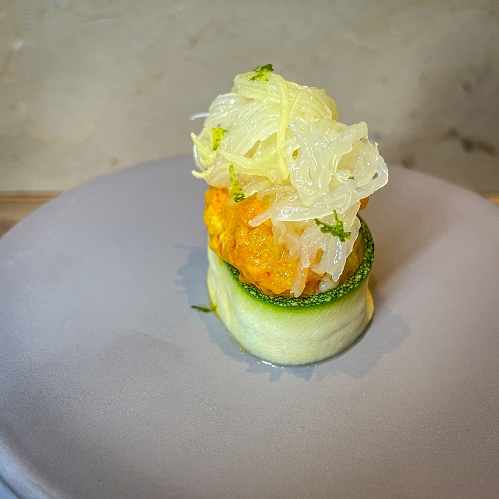 「大閘蟹/水果椒/蔥油/金沙醬」以台灣鹹蛋苦瓜為發想,以微甘水果椒取代苦瓜填入拌有蟹膏的大閘蟹肉,佐上鹹蛋與柴魚高湯調製而成的醬汁綴上少許蔥油,多重風味層層堆疊。