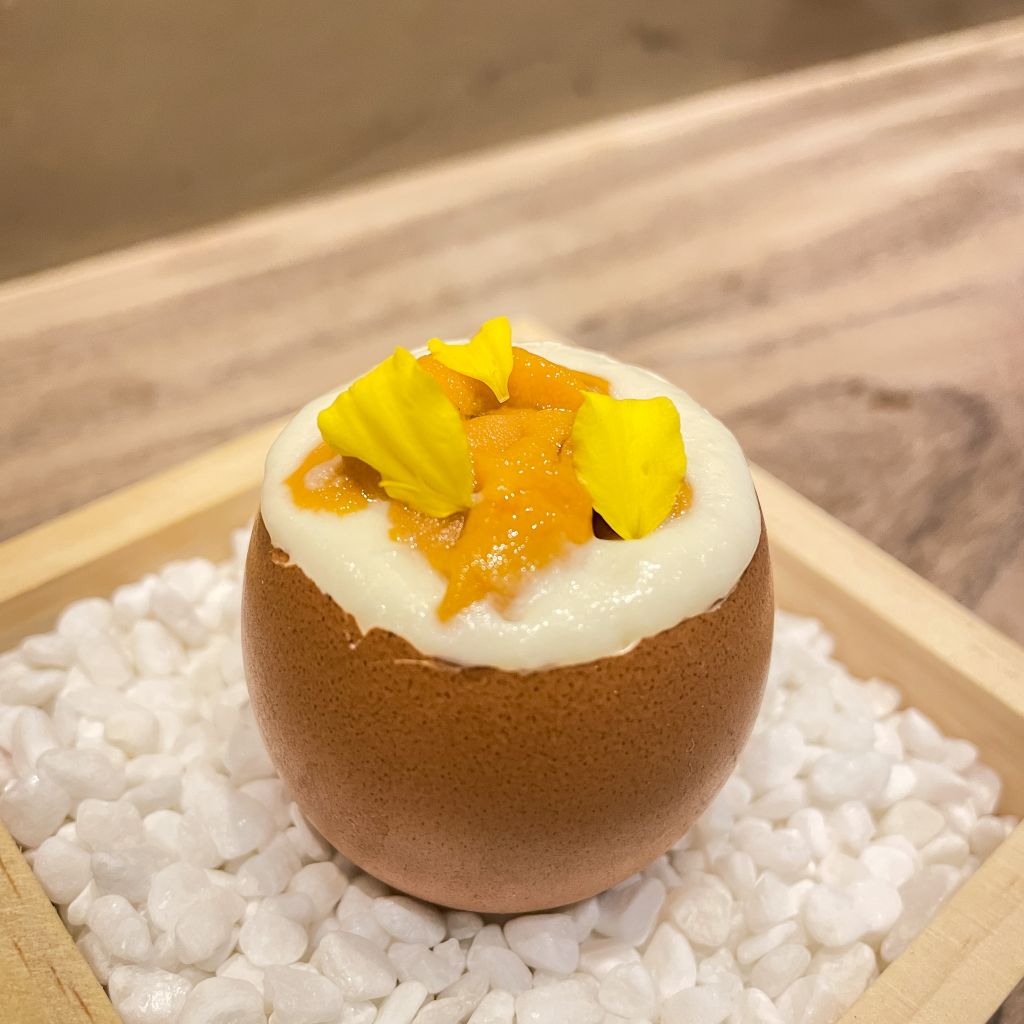 法魂日料極致呈現「大閘蟹/白花椰菜/馬糞海膽」,蛋白及白花椰菜交融成清爽澎潤的慕斯,搭上大閘蟹與馬糞海膽滑順口感,每口都交織成不同凡響的絕妙滋味。