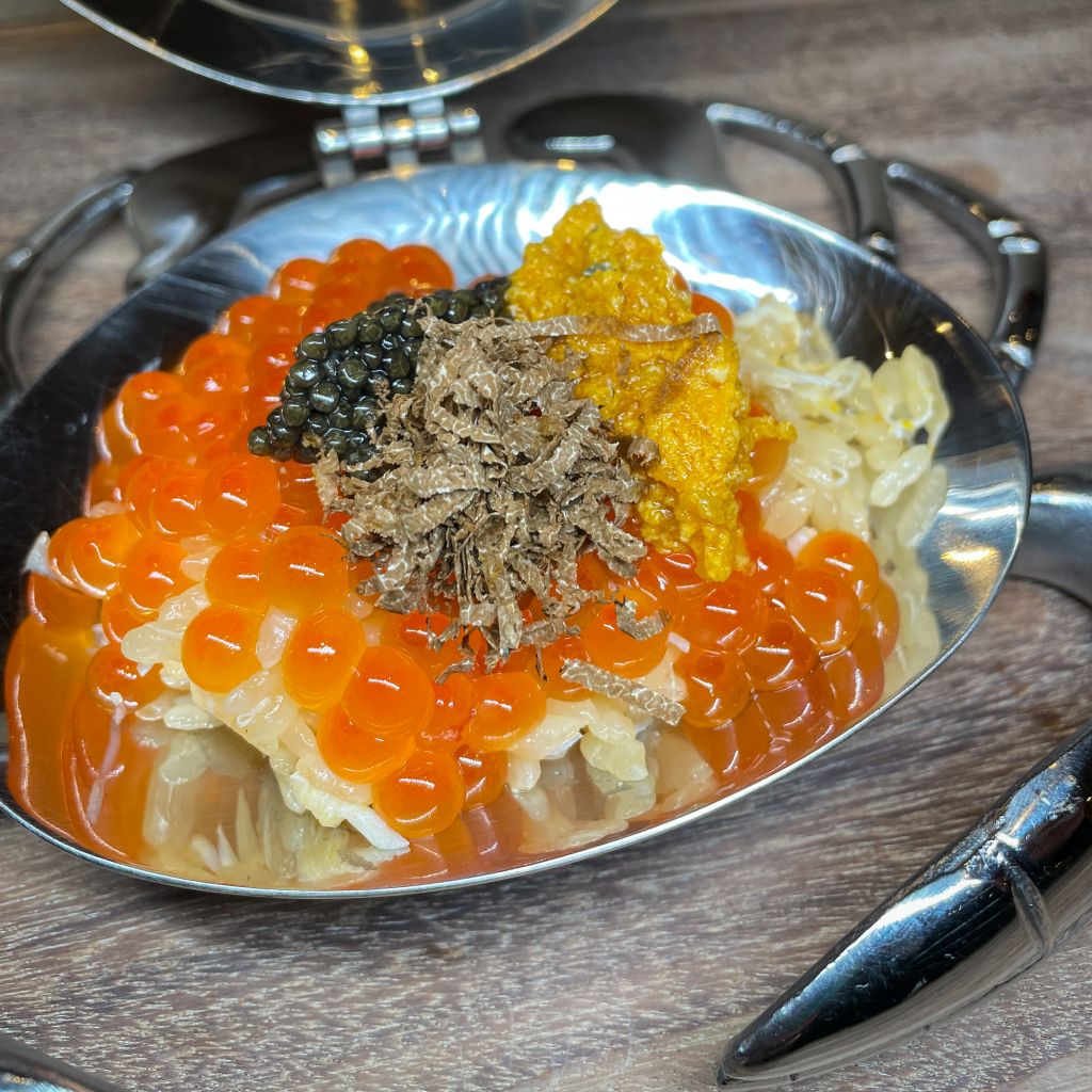 「大閘蟹釜飯/生筋子/蟹膏/魚子醬/黑松露」拌入大閘蟹肉、生筋子、蟹膏、魚子醬,各種馥郁美味一次擁有一次滿足!