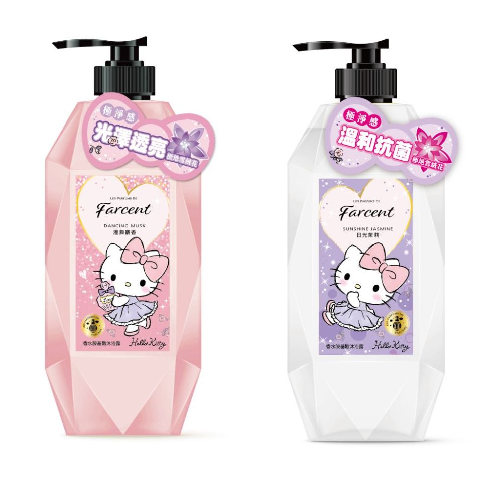 Farcent香水胺基酸沐浴露嚴選國際精品香水調,搭配超Q萌Hello Kitty推出的「日光茉莉」沐浴露清新花果調,以澄澈清爽的青蘋果與綠葉,揉合茉莉與雞蛋花香,交錯出溫柔沉穩的雪松,宛如置身清新果園。「漫舞麝香」沐浴露是以清新鈴蘭點綴優雅別緻玫瑰,酌以醇厚的琥珀與麝香溫暖烘托著,優雅浪漫,擁有令人傾倒的愉悅香氣。