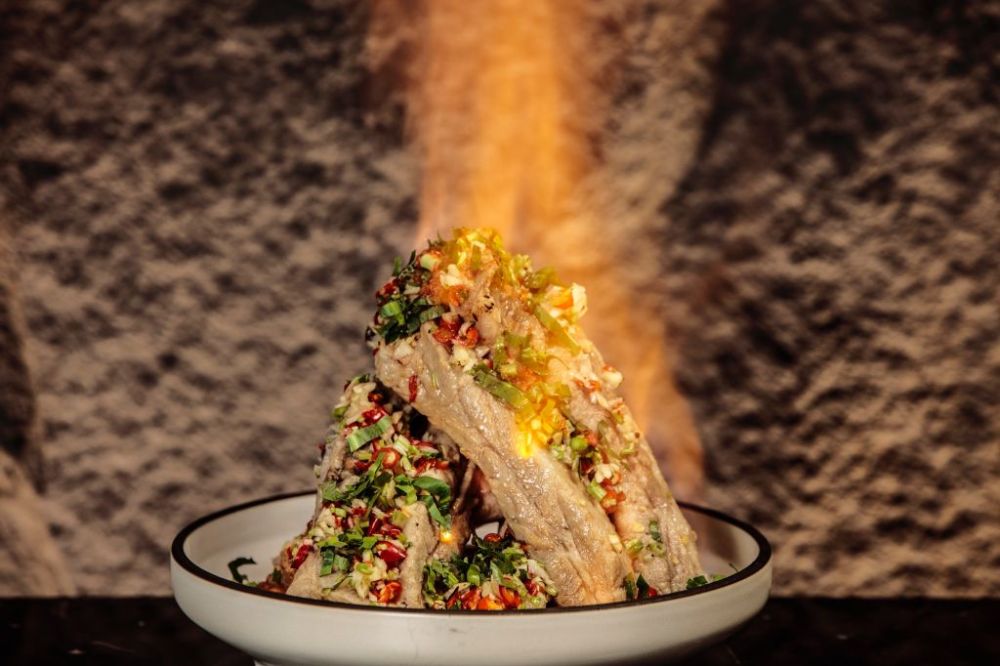泰殿的火山排骨將火山變成火焰山,活火山讓高達40度酒精燃燒,讓整個菜色更炙熱。「火山排骨」最適合的調酒為「金色泰殿」,濃郁果香與茶香搭配味道濃郁的菜餚,清爽解膩、豐富層次,加上清爽的金萱茶香,讓味道更平衡。