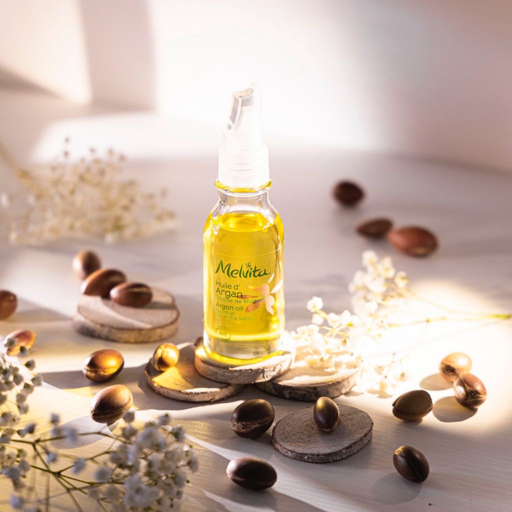 Melvita將鈴蘭香氛調和於摩洛哥堅果油,如絲綢般金黃油液,富含摩洛哥堅果油,豐富不飽和脂肪酸帶來優異保濕緊潤效果,具有心靈芳療的療癒舒適感。能用於髮絲、指甲與手肘等角質粗厚處,以良好修護作用,柔適提振安撫身心靈,為肌膚與心靈注入滿滿飽潤與幸福禮讚。