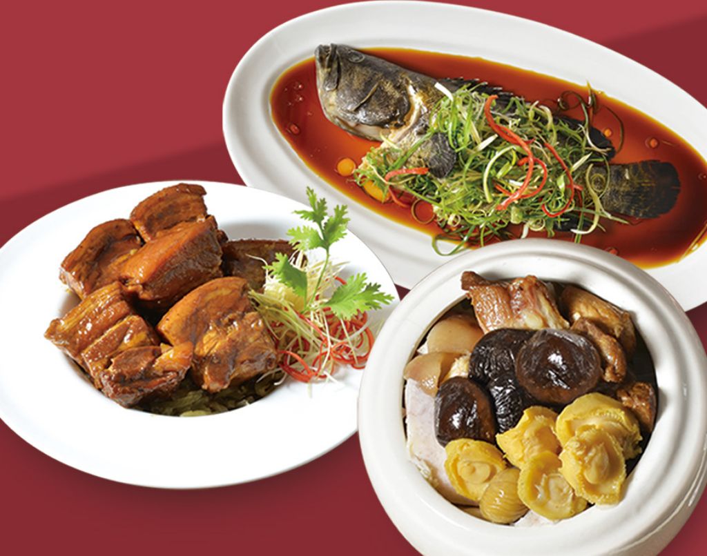 有匯聚蜜桃鴨、五香牛腱、紹興醉雞、涼拌海蜇及廣式燒味拼等豐富菜色。搭配酸甜的七彩米香魚、蜜汁香氣誘人的蜜汁肋排、花膠佛跳牆與港式酥炸年糕,光聽就令人口水直流。