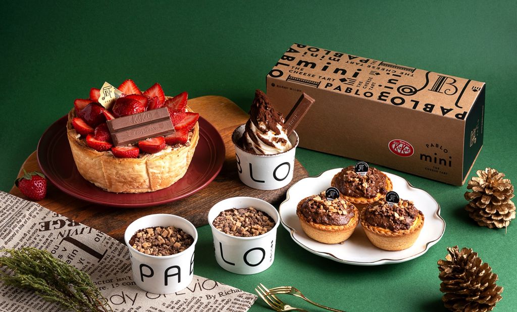 日本甜點品牌PABLO與雀巢KitKat巧克力攜手合作,獨家開發用草莓入餡入料的奇脆脆草莓派對起司塔、PABLO迷你-奇脆脆起司塔、咔脆起司霜淇淋、巧脆起司布丁4款送舊迎新、吃出好運經典系列獨創限定品項。