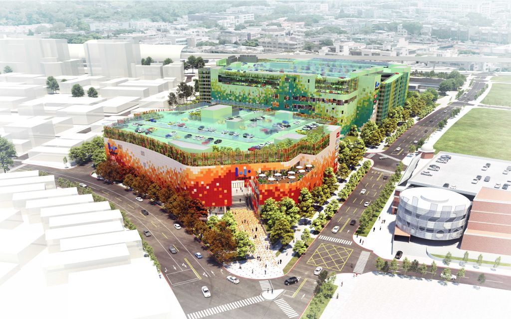 北館以融入緊鄰的湧泉公園綠意為視覺設計的元素,南館設計則與台中市民生活日常倚賴的建國市場紅磚外牆相互輝映。南北館店鋪面積超過2萬坪,全館開幕後顧客可以透過2棟商場建築間天橋串聯輕鬆悠遊於北館與南館之間,享受怡然自得的購物與移動的樂趣。