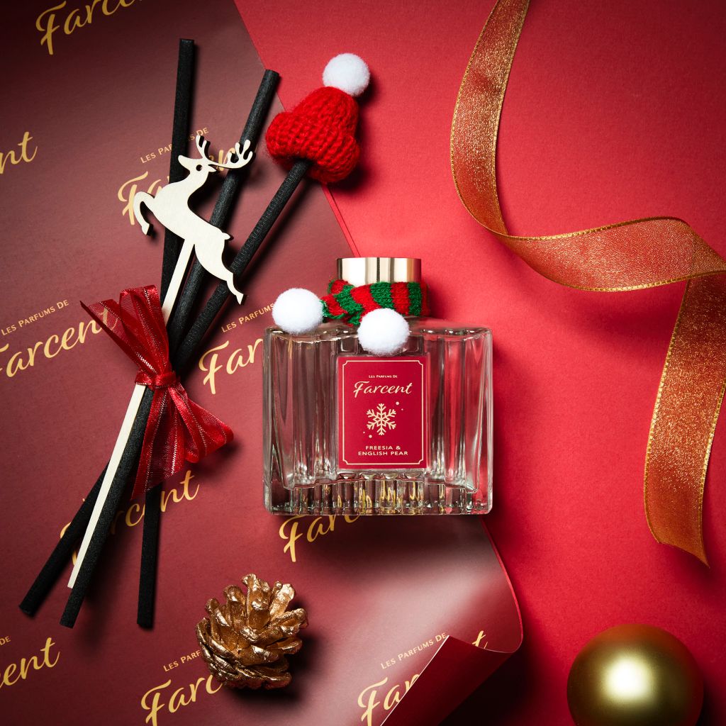 經典聖誕紅外盒「小蒼蘭&英國梨」是Farcent香水室內擴香經典熱銷款香型,聖誕限定款採用清新花果調,以小蒼蘭淡雅香氣疊加多汁梨香,再揉以玫瑰與萊姆的幽香,前調為佛手柑、萊姆、梨,中調是小蒼蘭、玫瑰、茉莉,後調為廣藿香、龍涎香、麝香。搭配小巧雅致的迷你毛帽、圍巾及麋鹿造型配件,讓擴香瓶成了最佳的聖誕裝飾品。