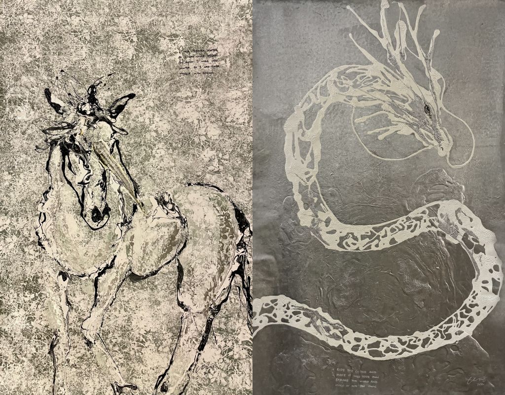 此次展出的平面創作出現了滴、淋、壓印、大面積塗刷勾勒山水,幻化出動物,畫面被堆疊地更厚實。有別於最初山水拓印時飄逸,顏料層疊出類似蠟筆筆觸,看似樸拙中道出動物的純真。部分畫作敷上金漆、銀漆、金箔與珠寶,回應神話世界的輝煌意象。
