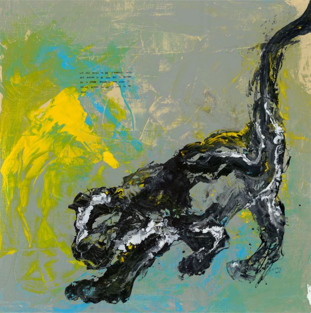 自小浸潤在書畫水墨養分與在西方教育環境。繪畫以一種詩書畫超融合,將動物作為唯一、最大、最豐富的藝術主題。用毛筆與丙烯畫出細節寫實感,像對待人一般,為動物描繪肖像。以近乎西方表現主義筆觸,用水與油漆勾勒山水遠景,用油漆筆落款的英文題詩,呢喃動物們無國界的思緒,也是融合中西方文化的沉思自語。