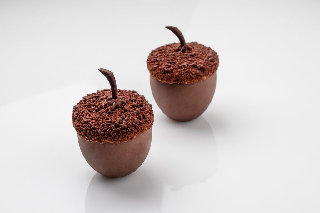 「焦糖杏仁橡木果實巧克力」是放大版橡木果實造型,別具童趣,焦糖杏仁慕斯包入自製焦糖杏仁醬,巧克力裹出橡木果實外型,撒上特製焦糖杏仁碎粒,一口咬下流芯滑順口感。