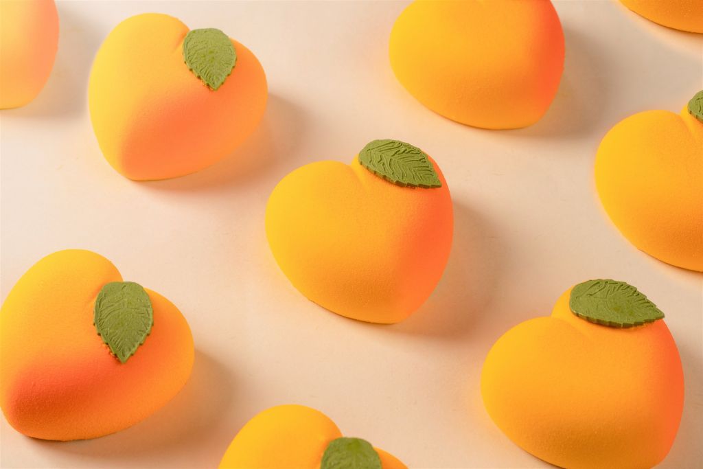 「柚香抹茶慕斯」主內餡為柚子凍,疊加抹茶奶餡,底部以抹茶蛋糕為基底,上面包覆柚香慕斯,橙黃愛心形狀以綠色小葉片妝點,捧在掌心、相當討喜。