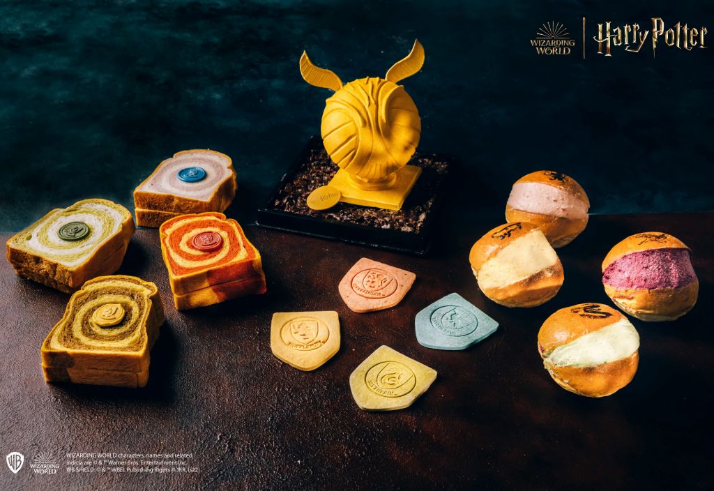 「金探子巧克力工藝」陳建佑主廚將哈利波特經典金探子打造成超擬真甜點,由63%法國黑巧克力包覆美式棉花糖,搭配可可玉米脆餅為底,外層灑上炫目的金光粉末造型,賦予輝煌光榮之意。同步販售霍格華茲學院獸-十勝生乳包、魔法漩渦厚片土司、霍格華茲學院徽章餅乾多款限量烘焙商品。