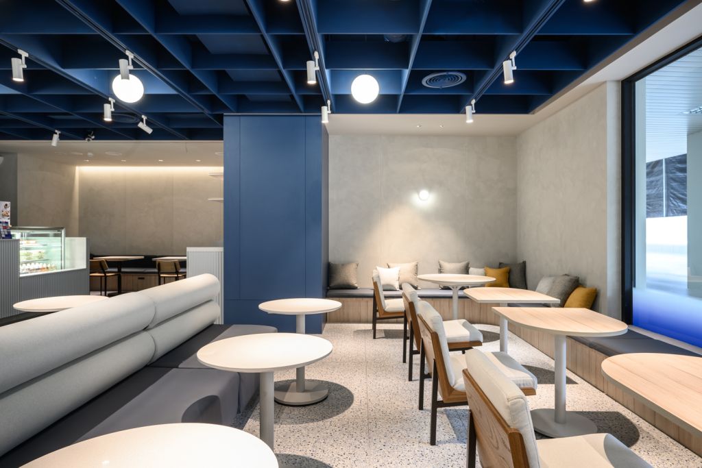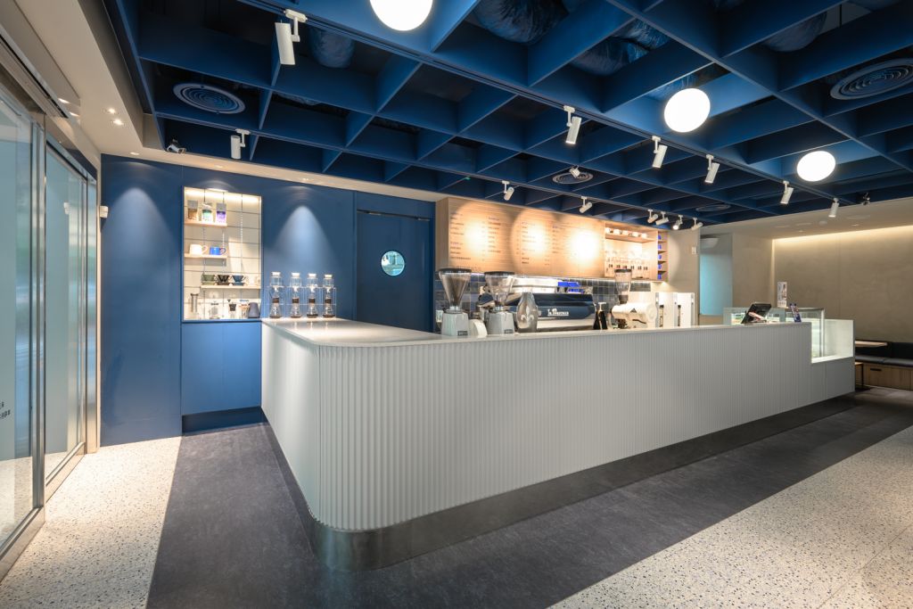 有靚設計團隊透過不同材質的藍色與淺色木紋,輔以金屬元素點綴,營造自然質感的舒適空間氛圍,利用大片落地玻璃窗提升店內採光、引進中山北路的綠意,打磨自然質感舒適氛圍。