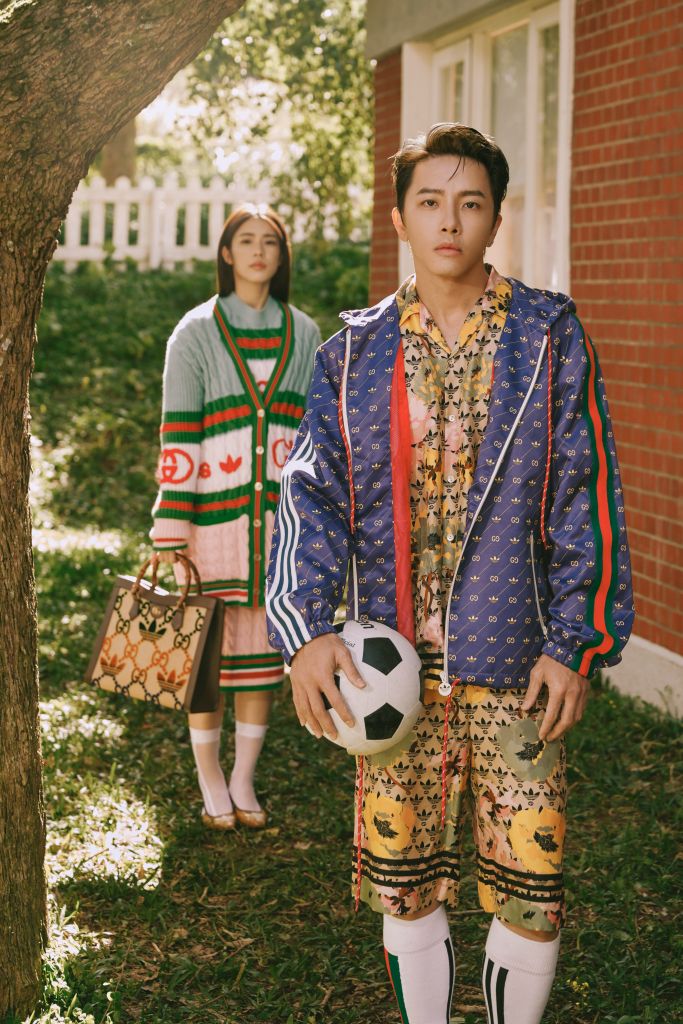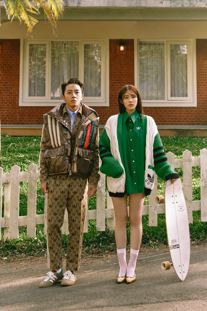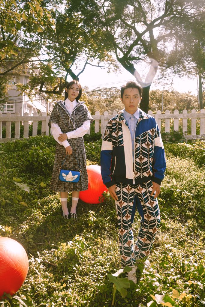 林思宇穿著一款粉色與粉藍色絞花針織羊毛開襟衫及同款連身洋裝,飾有adidas╳GUCCI三葉草徽標刺繡與織帶等細節。坤達身穿一套佈滿雙品牌LOGO印花保齡球衫套裝,搭配搶眼的藍紫色運動外套,一側袖子飾有adidas白色三條紋,另一側飾以GUCCI經典綠紅綠織帶。兩人展現絕佳的運動默契,以動態姿勢營造時髦運動的風格。