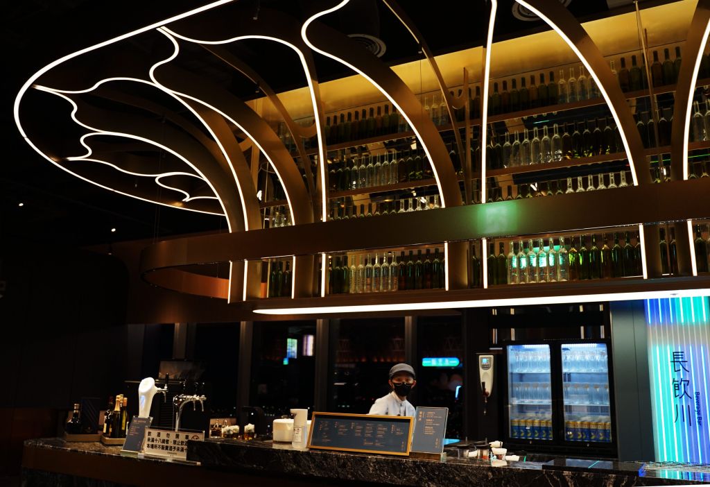 饗饗新莊店占地412坪、共264個座位,以近500顆半圓燈球打造INPARADISE迎賓燈牆,霓虹光流動炫染、光影映襯INPARADISE字體,為珍貴時刻,一起饗饗的盛宴拉開序幕。視覺中心最大亮點中島高空酒櫃「長飲川」,動態的燈光變化,ㄇ字型取餐大空間,佐餐暢飲,無限取用。