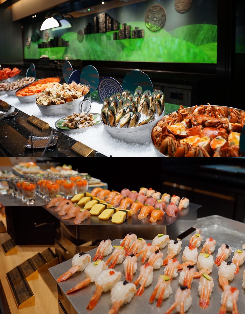 走過八大餐區光影指引的廊道,迎面是運用藍染與銀色雕塑不鏽鋼為背景,供應每日漁港直送海鮮、時鮮刺身的「豐大海」,及新鮮生菜沙拉與法式開胃小品「旬巧原」。優雅青花瓷製成藝術壁飾,突顯中式美感,巧搭供應燒鵝五吃、中式經典料理與港點的「京山」。