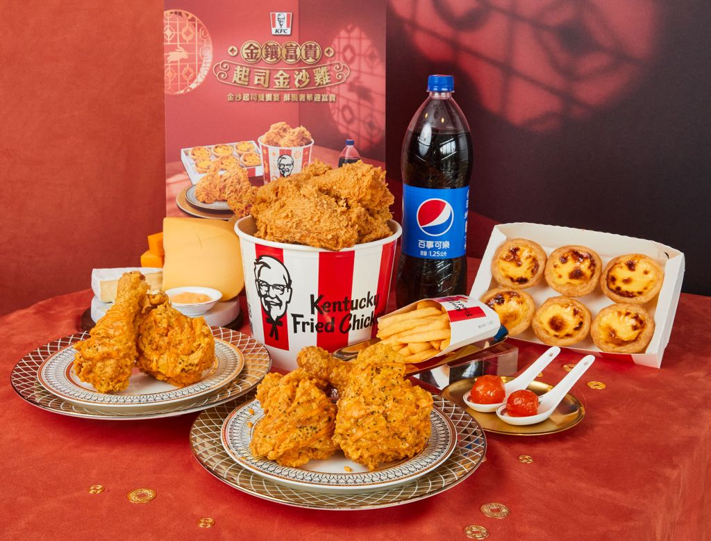 肯德基「金鑲富貴 起司金沙雞」淋上獨門配方鹹蛋金沙搭配切達&帕瑪森乳酪等多種起司,每口都能擁有多層次頂級享受,香濃口感享受豪華再升級!酥脆多汁的炸雞與金沙配上多種起司醬完美融合,碰撞美味新火花,驚豔的華麗美味搭上招財象徵的金黃炸雞,吃一口就欲罷不能。