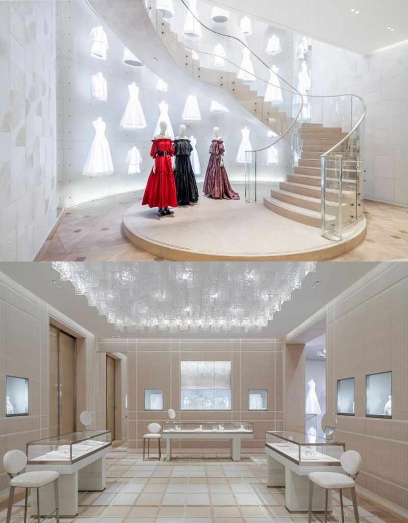 隨著凡爾賽宮的木鑲地板與一路延展至五樓的旋轉樓梯,則是從巴黎全新蒙田大道30號總店裏汲取靈感,展示整面的高級訂製服胚衣牆彰顯品牌底蘊,高級訂製工坊打造的純白胚布詩意般矗立於前,展現Dior的美學工藝精神。