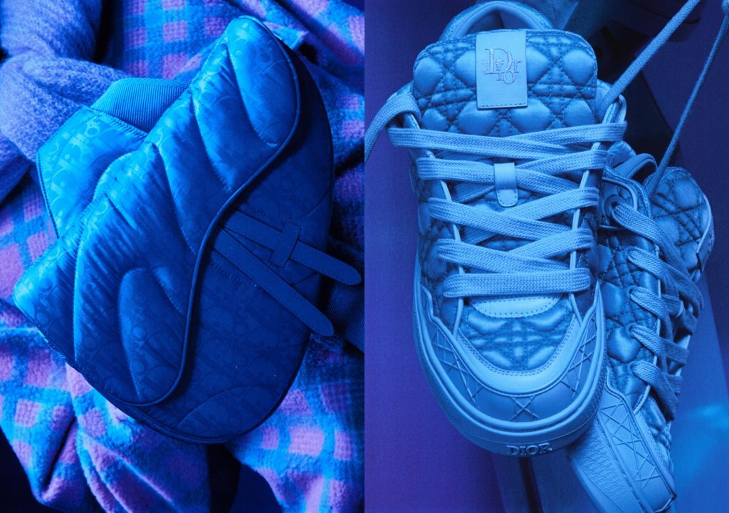 男裝區簡約的氛圍調性鋪陳於創意總監Kim Jones男裝與配件系列,以Kim Jones喜愛的各式深淺藍色為主要視覺組成,一抹藍色剪影的抽象畫作是蘇格蘭藝術家Peter Seal的拼接布材剪影抽象創作。