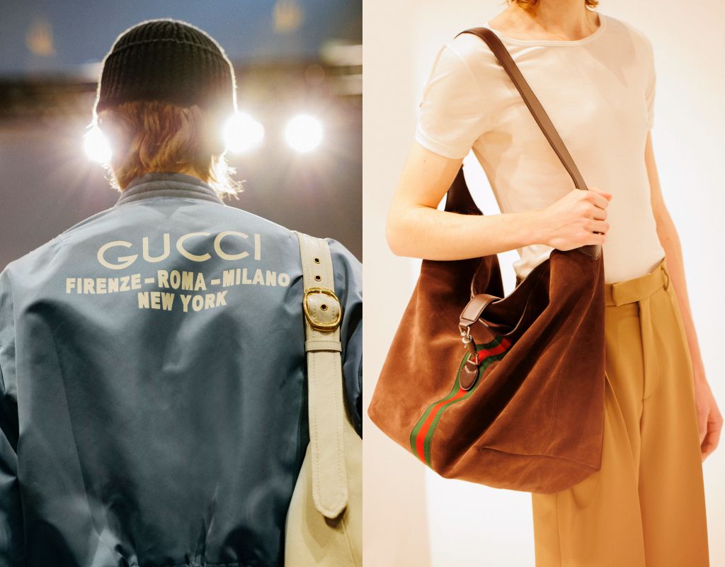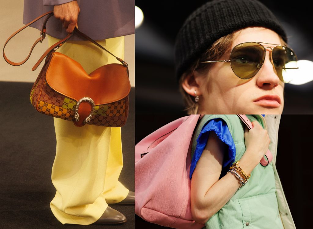 串連經典與當代古馳宇宙,彩色塗層帆布製成肩揹包成了服裝造型視覺亮點,Crystal GG帆布運用在新款長方形休閒手提袋、70年代經典圓頭踝靴、高跟拖鞋、標誌性綠紅綠織帶Princetown拖鞋,及具仿舊效果的馬銜鍊樂福鞋,體現個性化強調。柔軟的絎縫機車靴以多種顏色首次亮相。