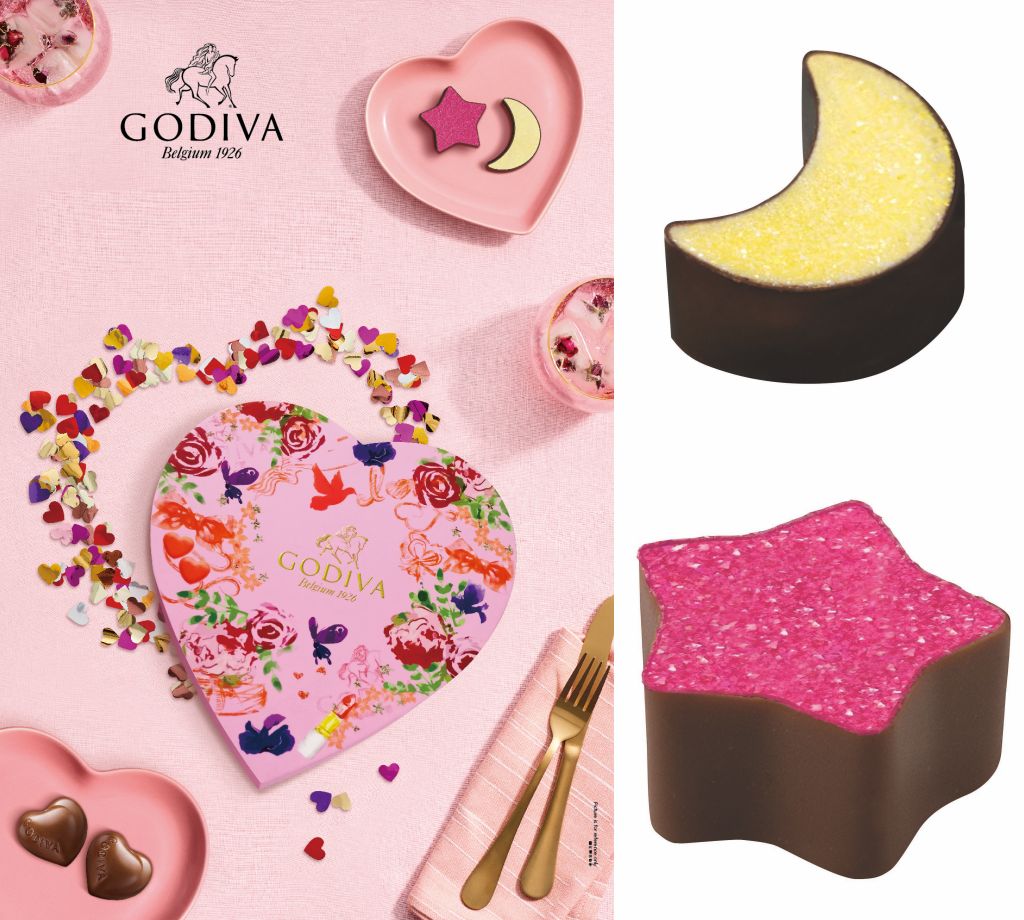 GODIVA 2023摯愛限定巧克力禮盒甄選頂級可可打造濃醇匠心之選、創意呈現星星形、彎月形等多款迷人絢麗的造型,搭配季節限定、耀眼奪目的糖果碎片,在濃黑巧克力襯托下閃閃發亮,月影星光遙相輝映,帶來無比浪漫的柔美氛圍,