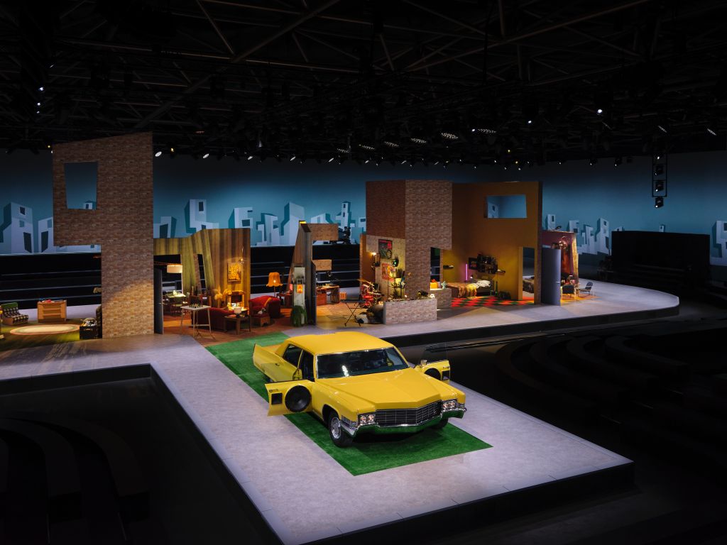 牛仔服碎片呈現光滑、 開叉、苦惱或從碎片交織的外觀,表現在電視螢幕固有的光學幻覺與效果。套裝與牛仔服碎片的基調,是透過高質感菲爾雪尼爾會形成眼睛的炸開式影像,這只能透過相機鏡片看到。