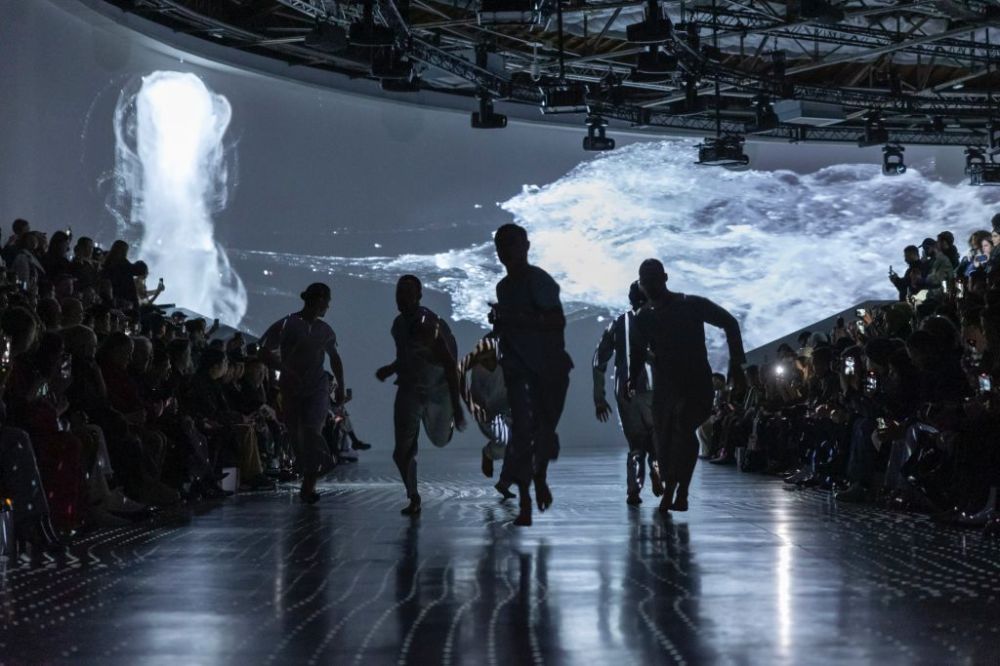 燈光一暗,服裝秀開始。純白空間灑落銀河繁星般投影,無數個小點隨著音樂流動、變形,沈浸式視聽饗宴將在場觀眾抽離現實世界。