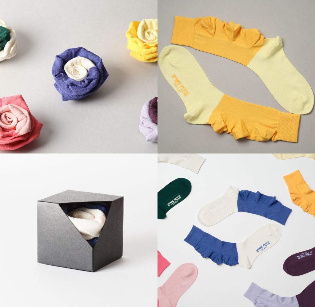 HOMME PLISSÉ ISSEY MIYAKE以花朵綻放的華麗樣貌連結情人節,「FLOWERS繁花綻放」系列以花苞為設計靈感做發想,是一雙襪子,也同時是一朵花,2種柔彩相互搭配,並於襪子後方添加花苞造型,捲曲時可以完整呈現花朵含苞待放型態,包裝以花瓶為靈感,呼應本季春夏主題”花與器”,以灰色調為底色,襯托襪子本身繽紛色彩。