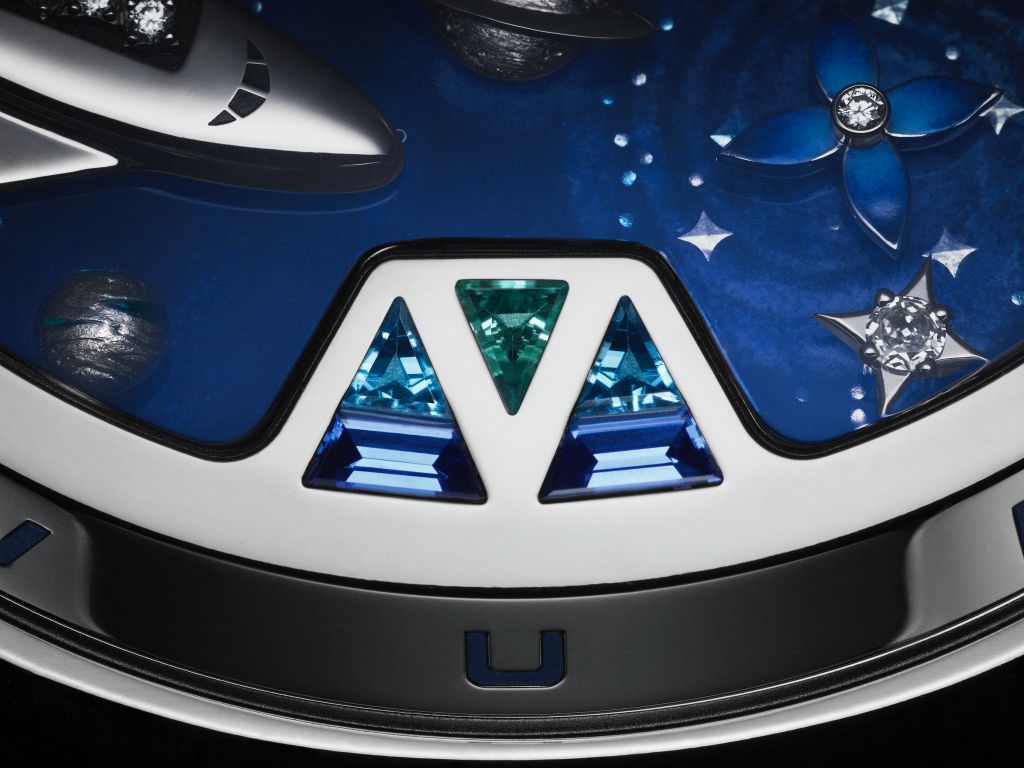 為展現征服太空設計主題,LV構想一款象徵未來的腕錶,由雕刻匠師Dick Steenman與琺瑯匠師Anita Porchet兩位著名工匠攜手合作,展現經典高級製錶傳統卓越技術,首度採用帶有大教堂鐘聲三問報時裝置自動裝置,生動呈現出色錶盤。