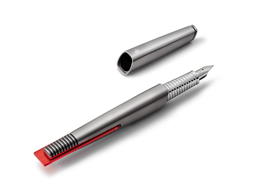 FERRARI STILEMA SP3限量款筆蓋與筆身,使用很少出現在MONTBLANC書寫工具的輕鈦製作,表現了汽車的流線型設計。筆蓋頂部斜角仿照DAYTONA SP3車頭切入空氣角度,筆身前端與筆身的橫紋裝飾,則是模仿汽車保險槓上葉片,線條在燈光映照下呈現明暗交集的視覺效果。
